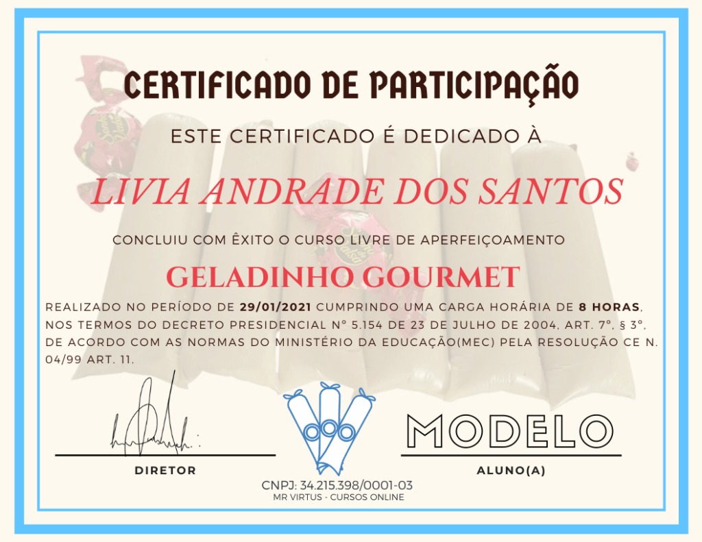 Após finalizar todas as aulas do curso você terá acesso a um certificado de conclusão atestando a sua capacitação no Curso Geladinho Gourmet.